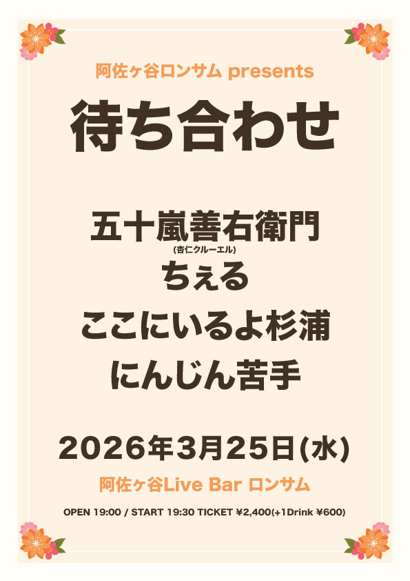 ADV ¥3,000 / DOOR ¥3,500(+1Drink ¥600)